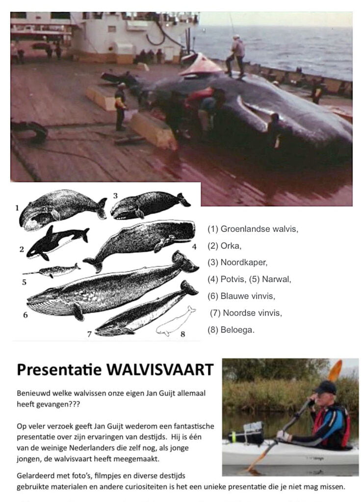 Jan Guijt komt een unieke presentatie geven over de walvisvaart. Hij is één van de weinige Nederlanders die zelf nog, als jonge jongen, de walvisvaart heeft meegemaakt.