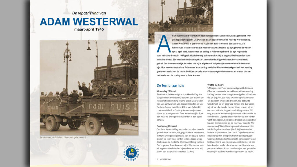 In onze serie digitale artikelen publiceert de Historische Kring Velsen vandaag het verslag van Adam Westerwal van zijn repatriëringstocht. Onze vaste vormgeefster Margriet Prins heeft het artikel prachtig bewerkt waardoor het bekeken en gelezen kan worden in de mooie stijl en layout van onze Velisena’s.