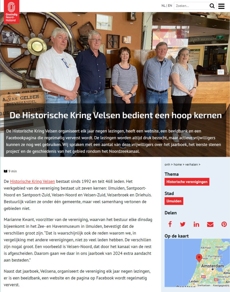 Het werd een geanimeerd gesprek over onze vereniging, onze vrijwilligers, onze werkzaamheden en onze activiteiten. Dit resulteerde in een mooi verslag van dit interview met een aantal toepasselijke afbeeldingen uit het verleden van Velsen. Het interview werd eind juni gepubliceerd op de website van Oneindig Noord-Holland.