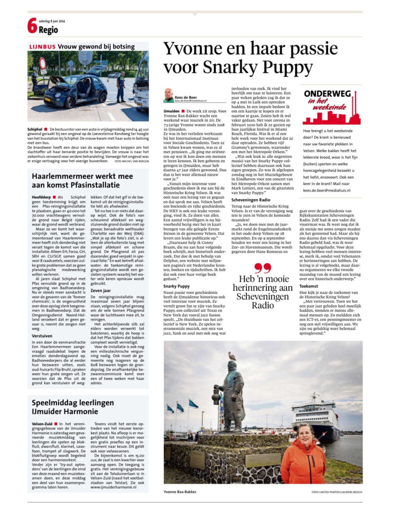 Lees over haar binding met IJmuiden, haar passie voor de jazzfusion band “Snarky Puppy” (van wie zij veel live concerten bezoekt), haar interesse in historie en vooral ook over ontwikkelingen bij de Historische Kring Velsen.