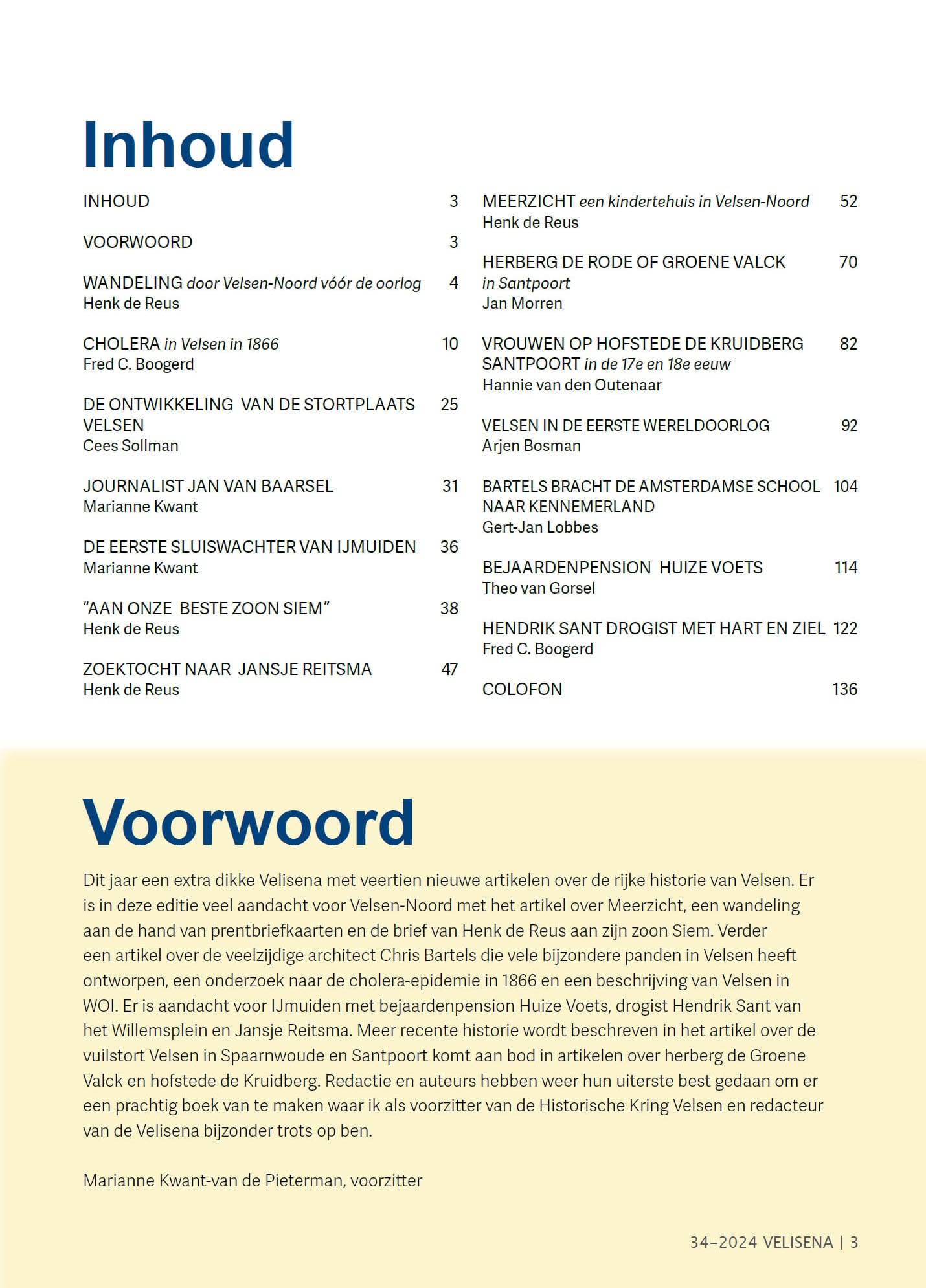 Er is in deze editie veel aandacht voor Velsen-Noord met een artikel over Meerzicht, een wandeling aan de hand van prentbriefkaarten en de brief van Henk de Reus aan zijn zoon Siem in WOII. Verder een artikel over de veelzijdige architect Chris Bartels die vele bijzondere panden in Velsen heeft ontworpen, een onderzoek naar de choleraepidemie in 1866 en een beschrijving van Velsen in WOI.