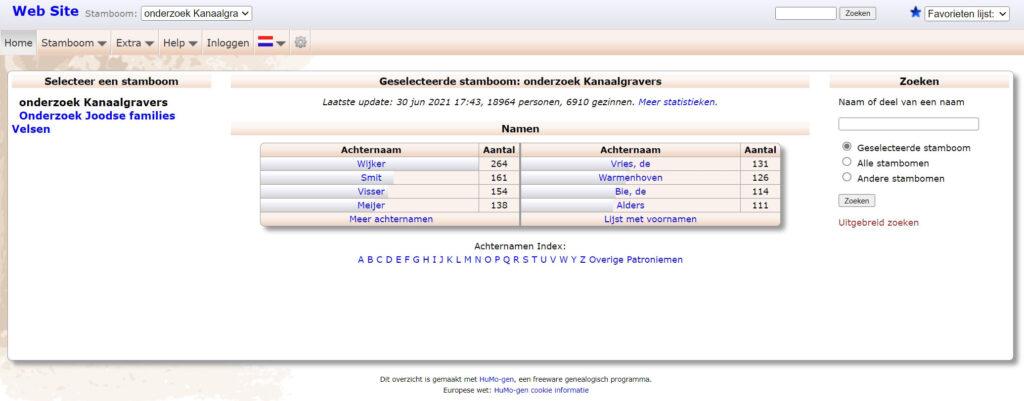 Indien u op zoek bent naar namen en/of families uit uw eigen verleden (familie- of stamboom-onderzoek) of u bent op zoek naar namen van de kanaalgravers van Velsen (onze verre voorouders) dan kunt u veel gegevens vinden in de Genealogie-database van de Historische Kring Velsen die online beschikbaar is.